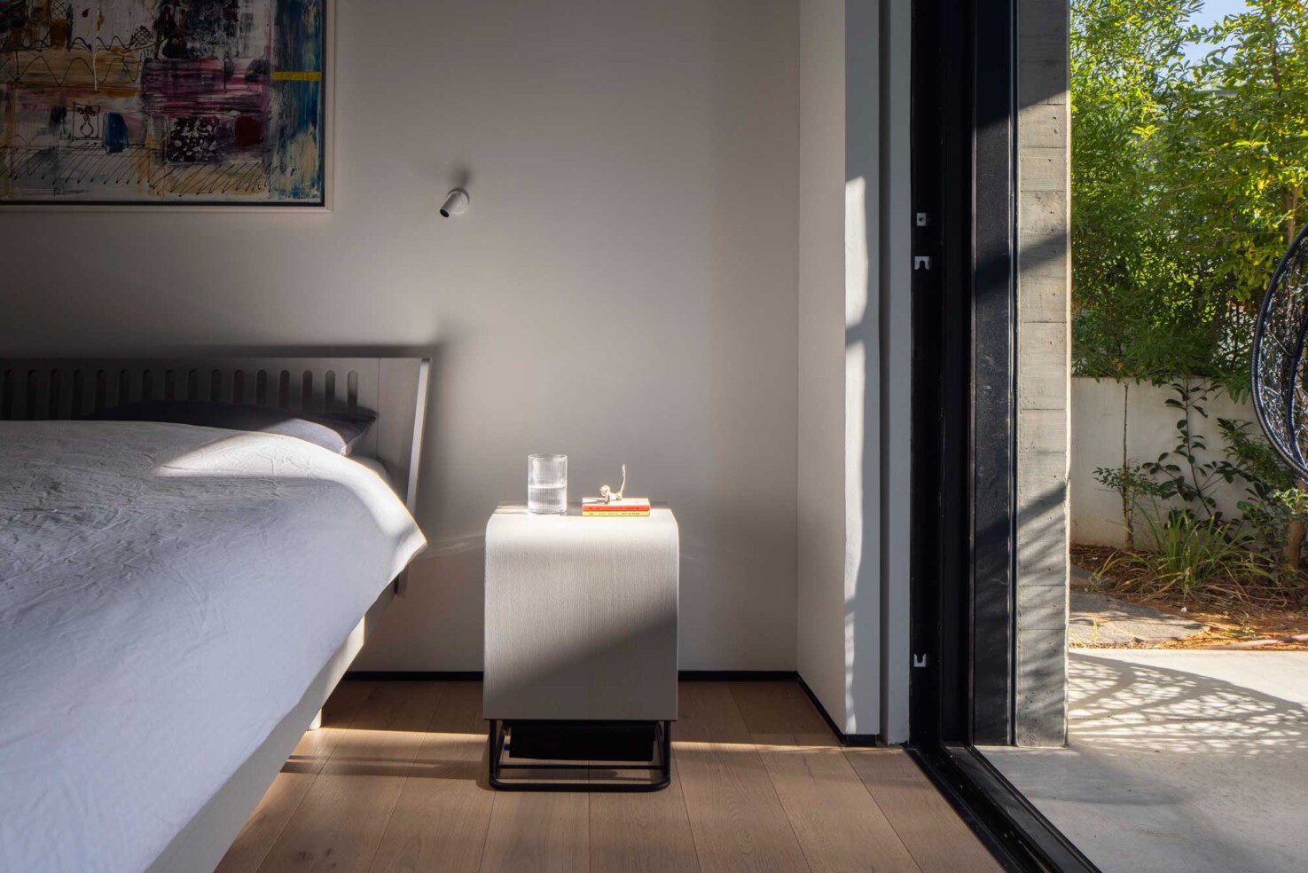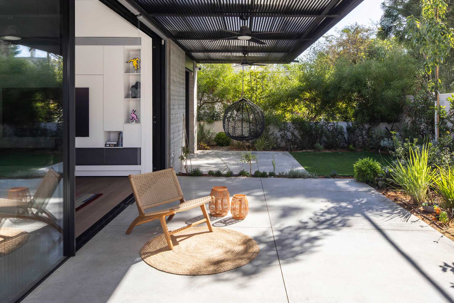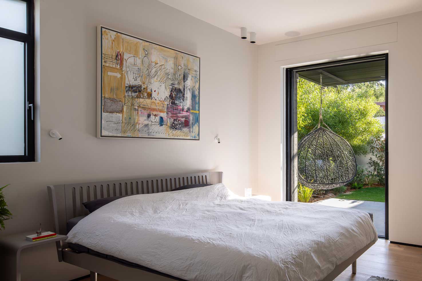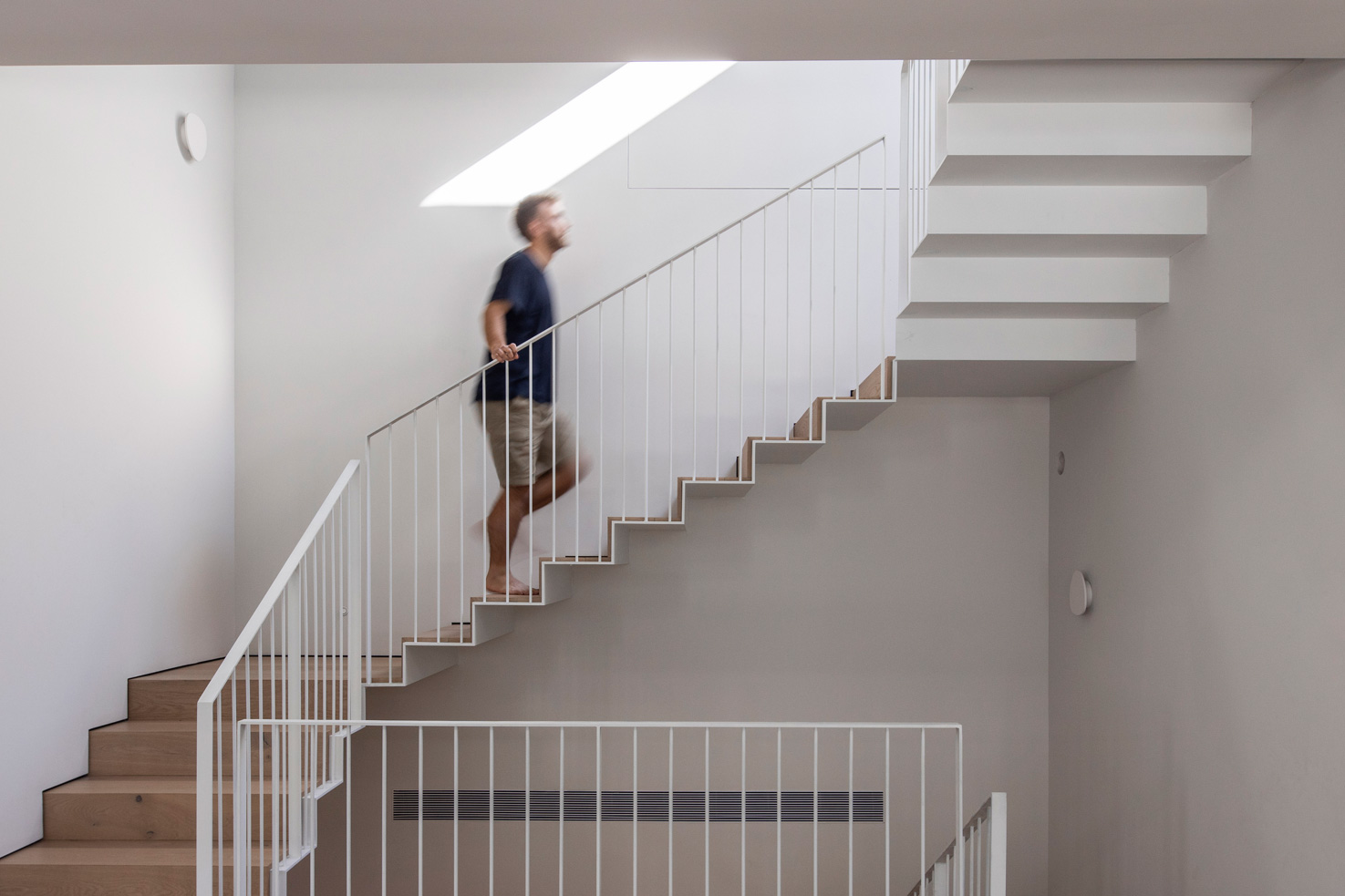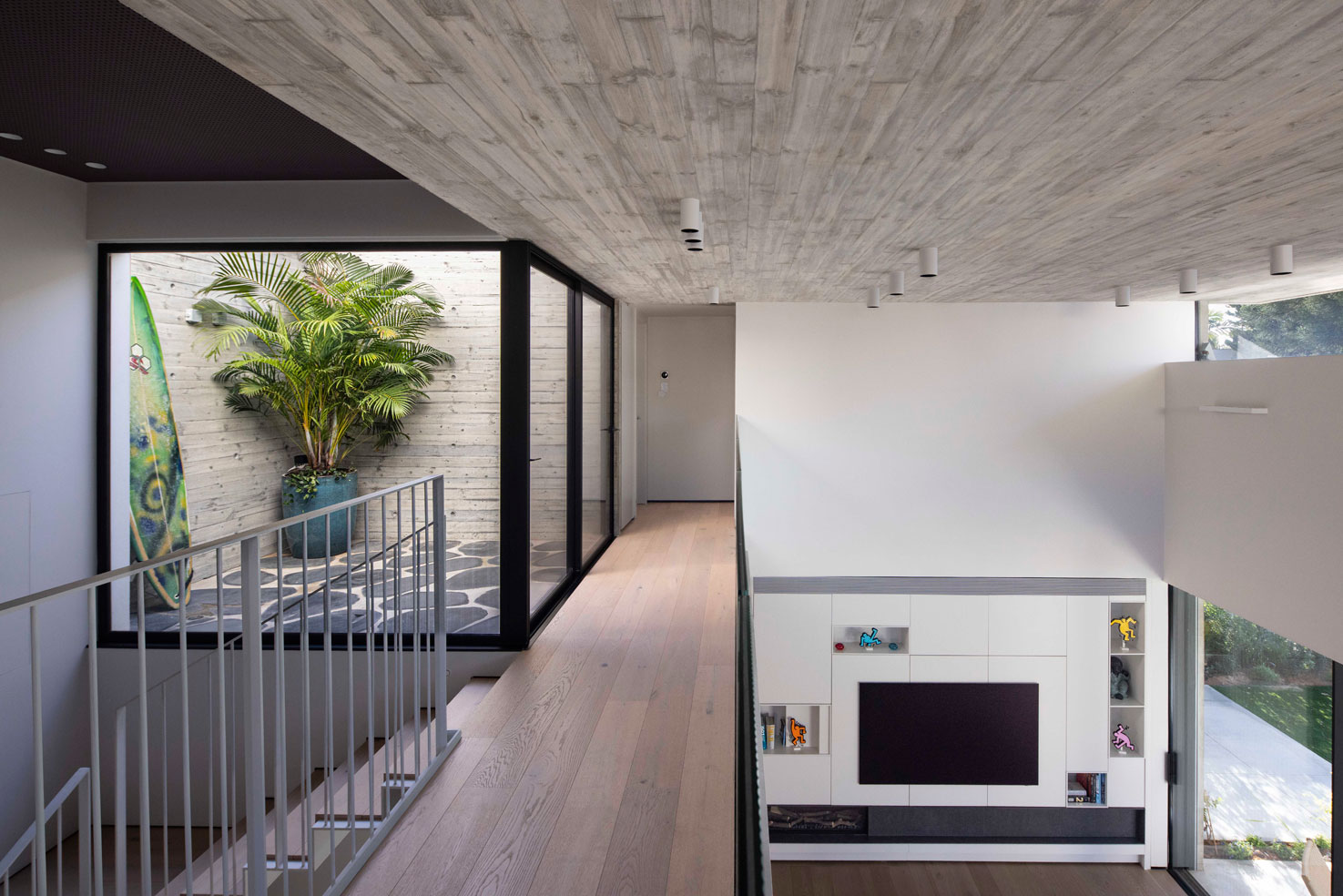 מדרגות מתכת דקיקות כנייר עולות לגשר שמחבר בין שני חדרי הילדים בקומה א׳. פאטיו שנגרע מהחלל הפנימי מאיר את עומק הקומה, וכמו החלונות העליונים משחרר גם הוא את האוויר החם.