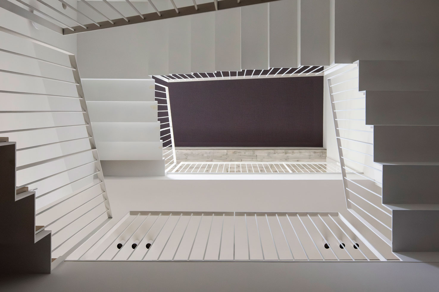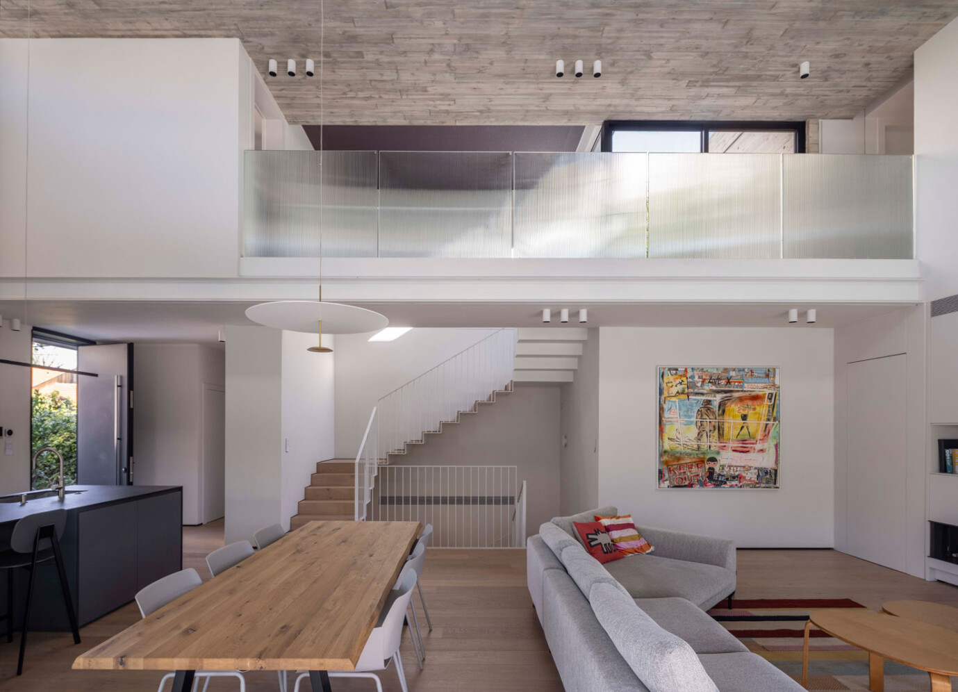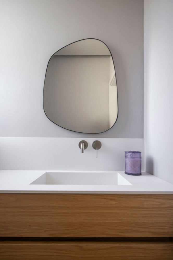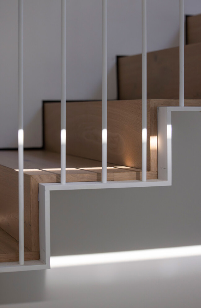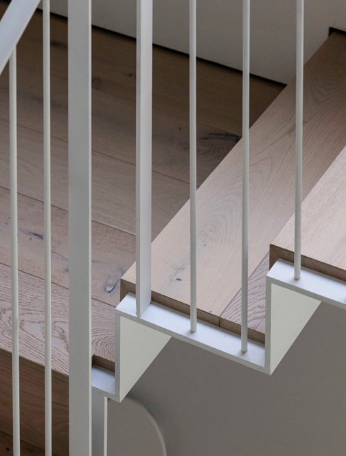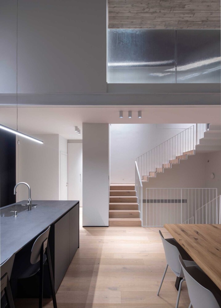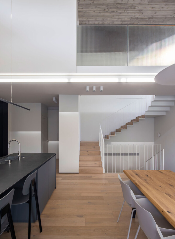 בטון, מתכת וטיח לבן – פאלטה של גוונים וחומרים קרים. בניגוד ובהשלמה להם, כל הרצפות עשויות עץ ותקרת חדר המדרגות צבועה בסגול עז.