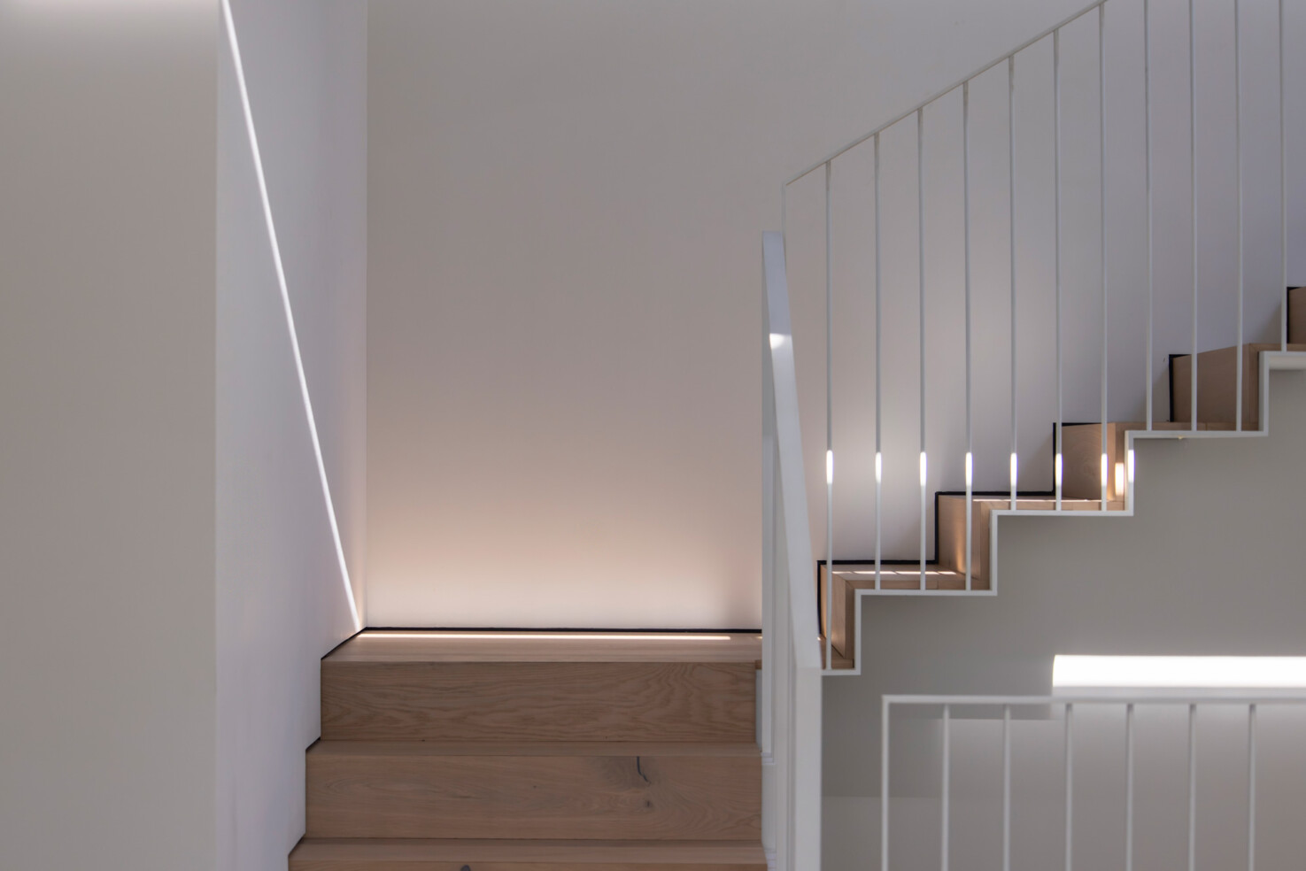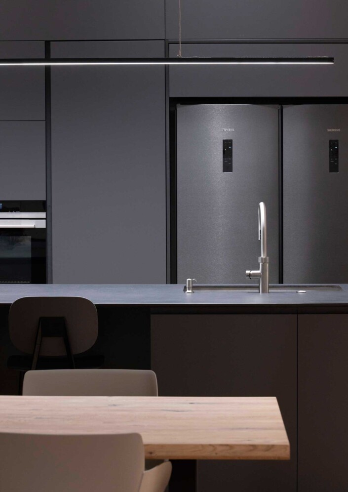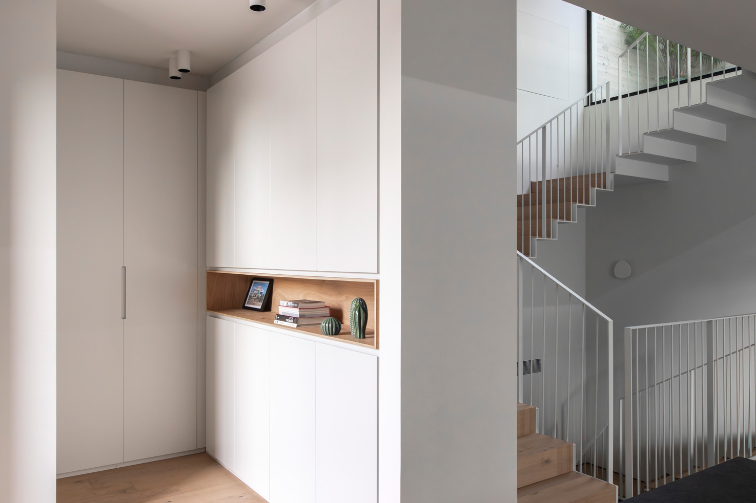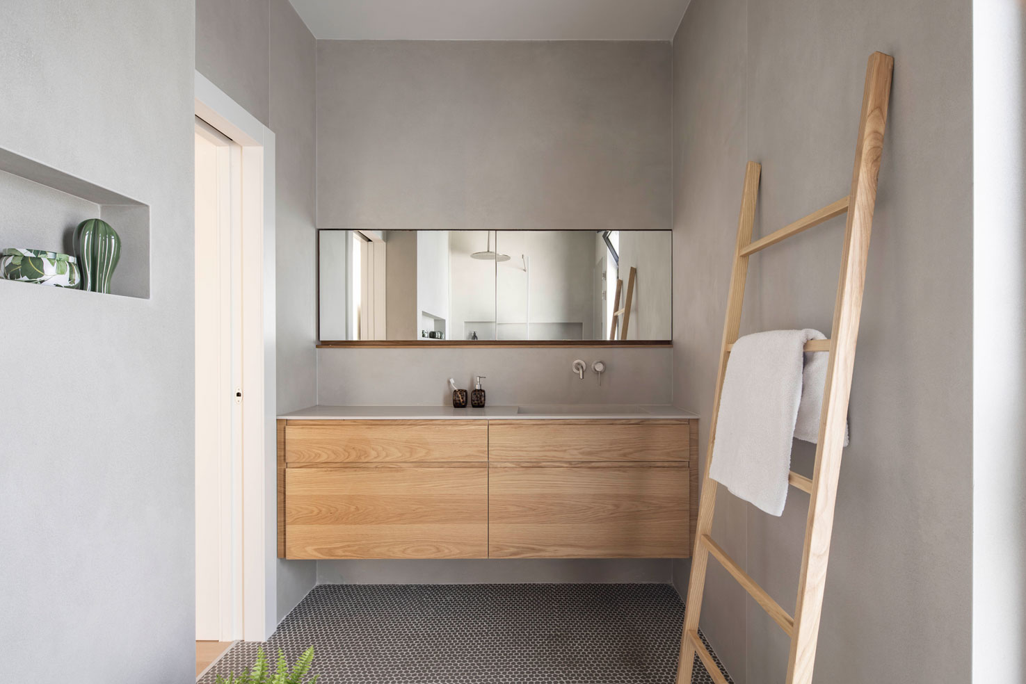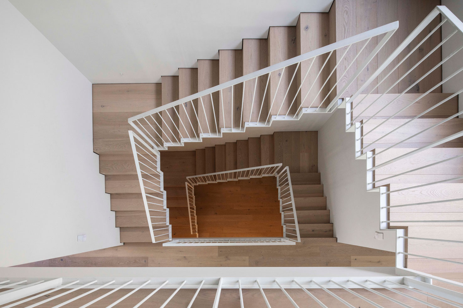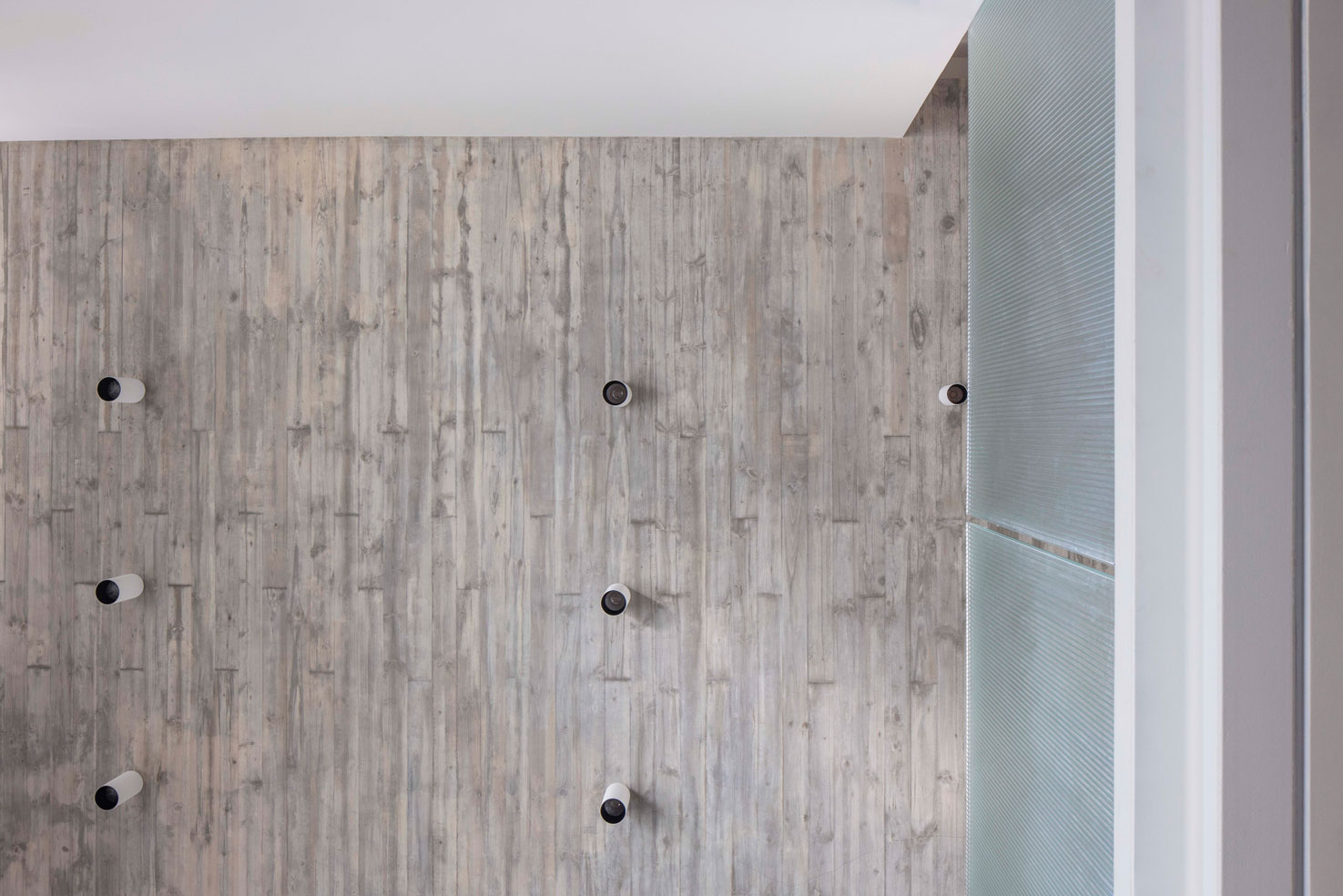 בטון, מתכת וטיח לבן – פאלטה של גוונים וחומרים קרים. בניגוד ובהשלמה להם, כל הרצפות עשויות עץ ותקרת חדר המדרגות צבועה בסגול עז.