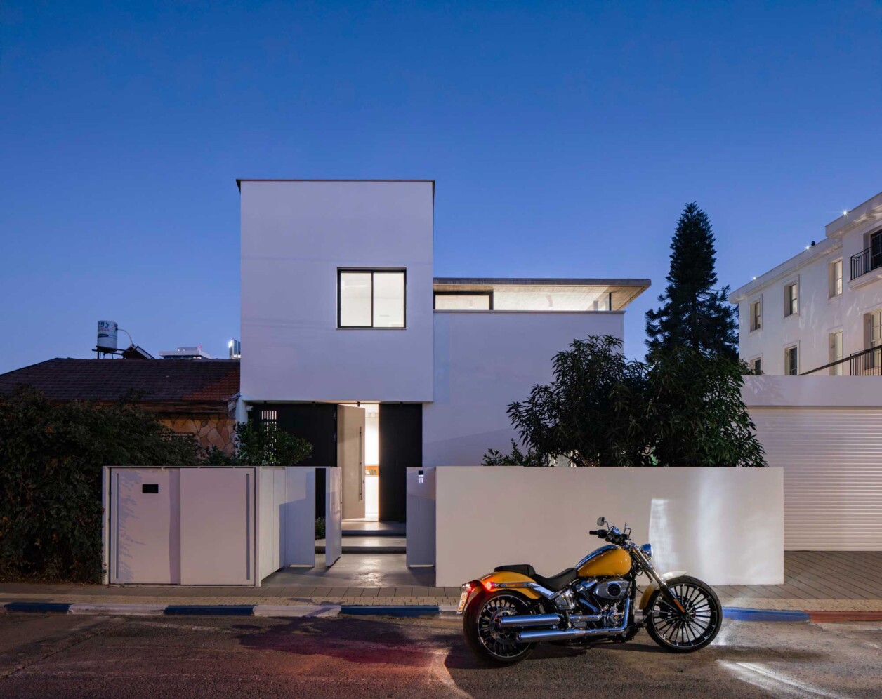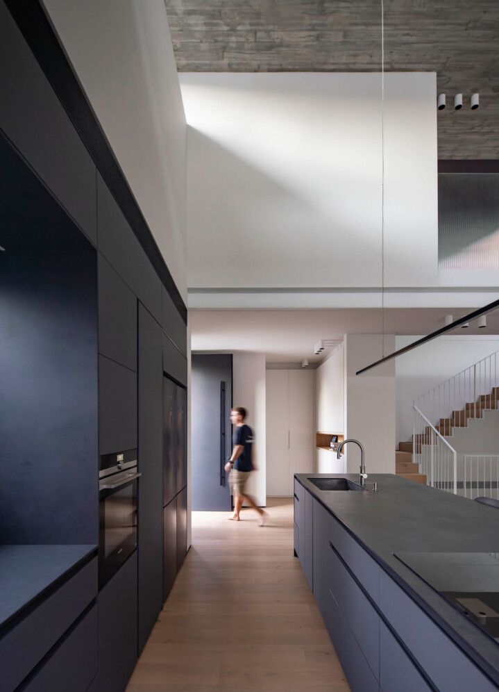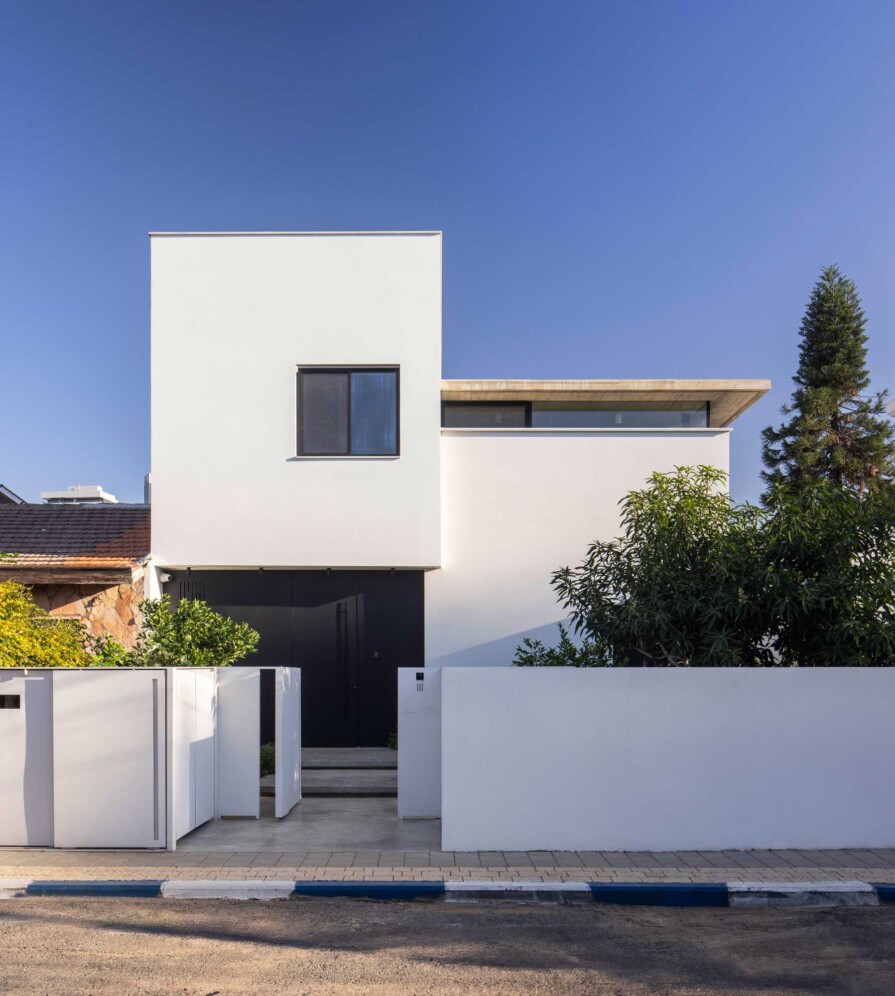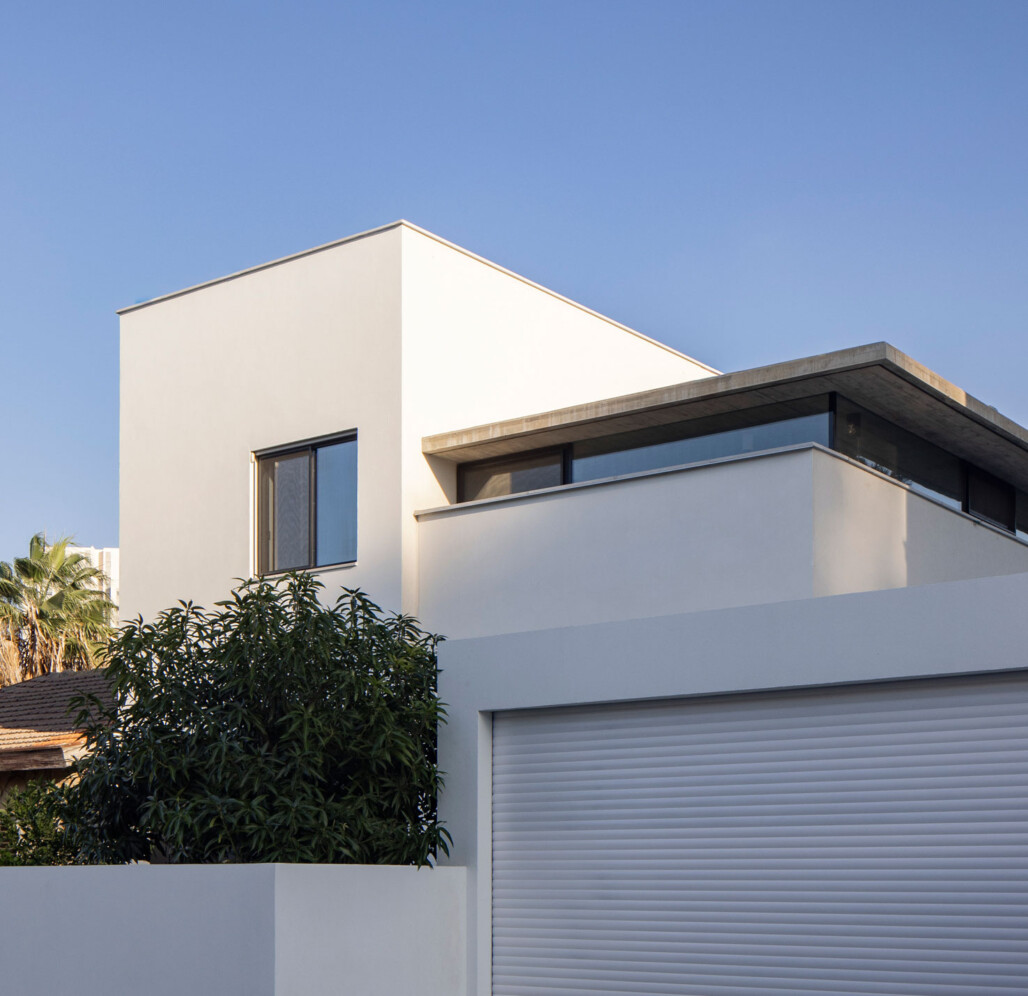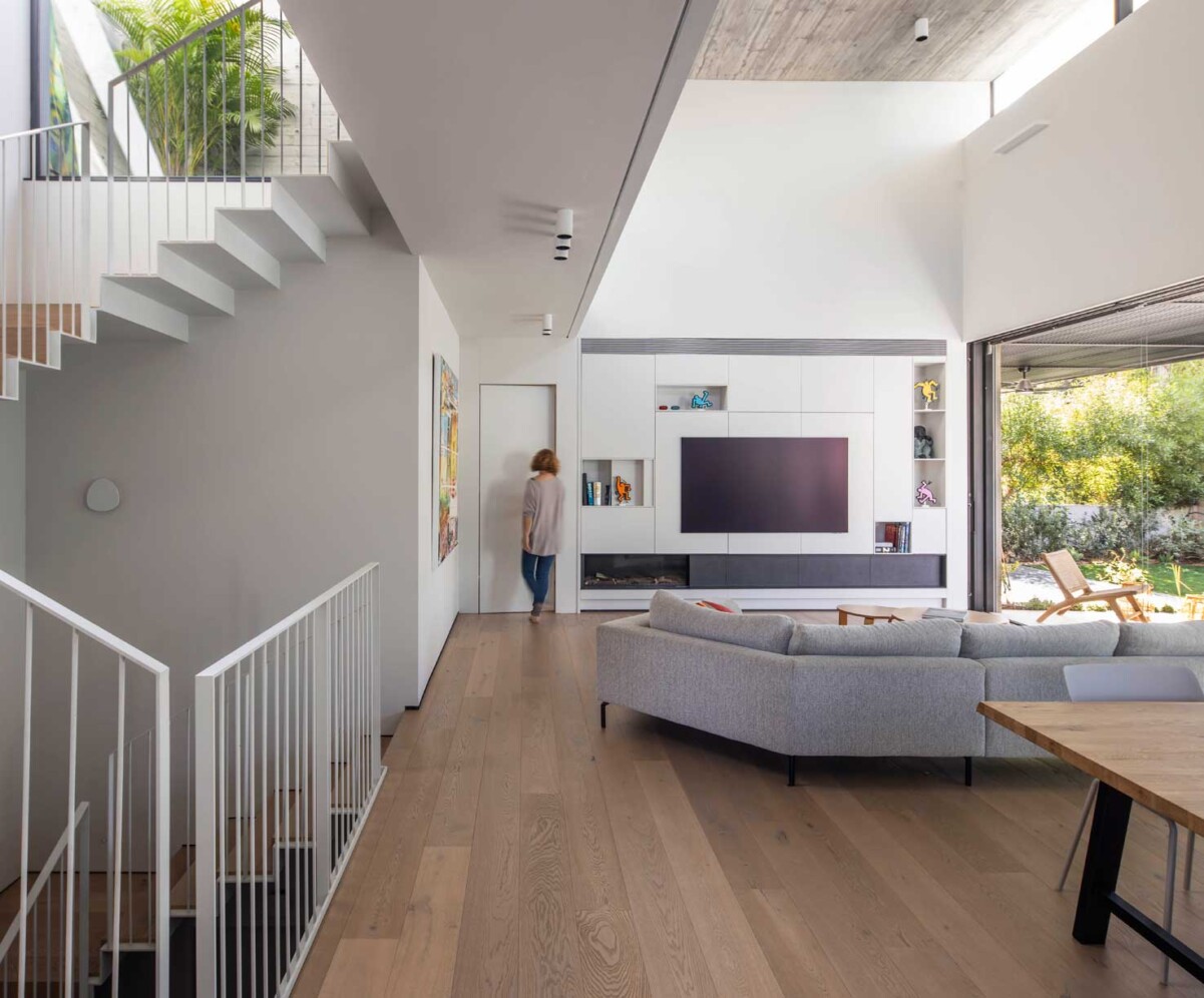 את הבית בתל-אביב תיכננו עבור זוג עם שני ילדים. מתוך המאסה הפנימית ״חצבנו״ חלל כפול בגובה שתי קומות, ומעליו מתחנו תקרת בטון דקיקה שמרחפת חצי מטר מעל הקירות ההיקפיים ומגדירה את האזור הציבורי. הפרדת הזכוכית בין התקרה לקירות מכניסה אור טבעי והחלונות העליונים מאפשרים לאוויר החם שעולה למעלה להשתחרר החוצה ולאוורר את החלל.