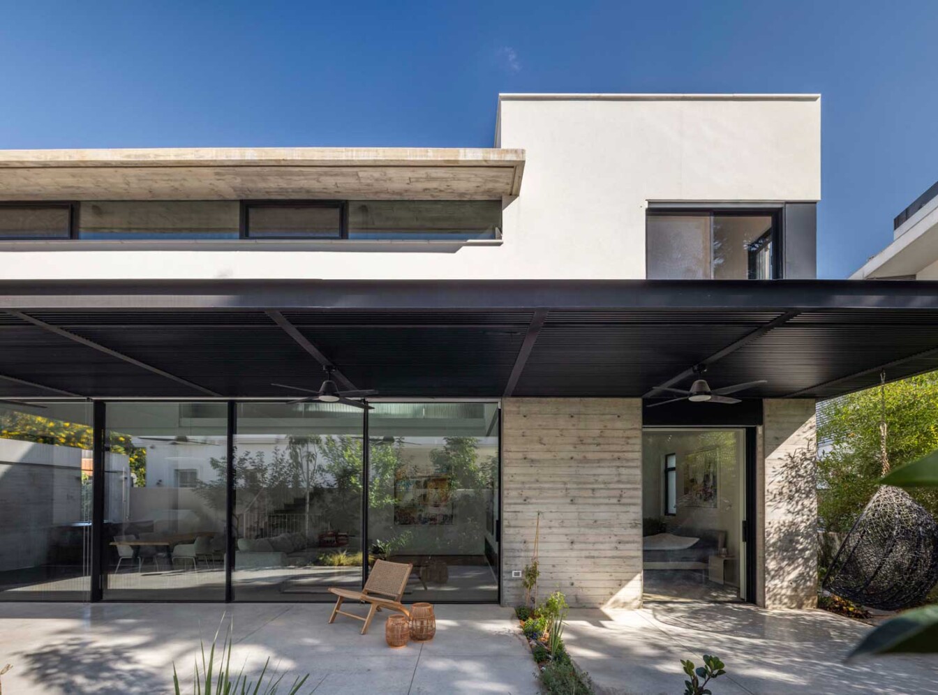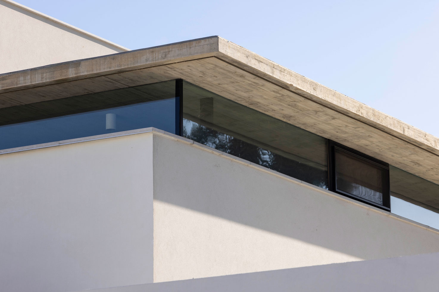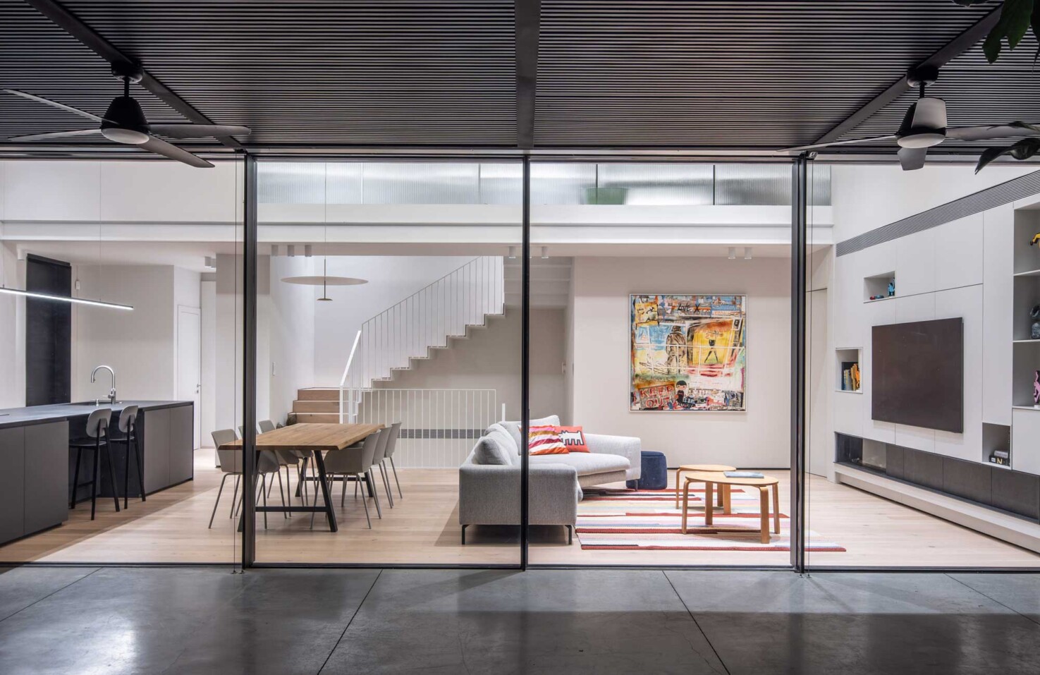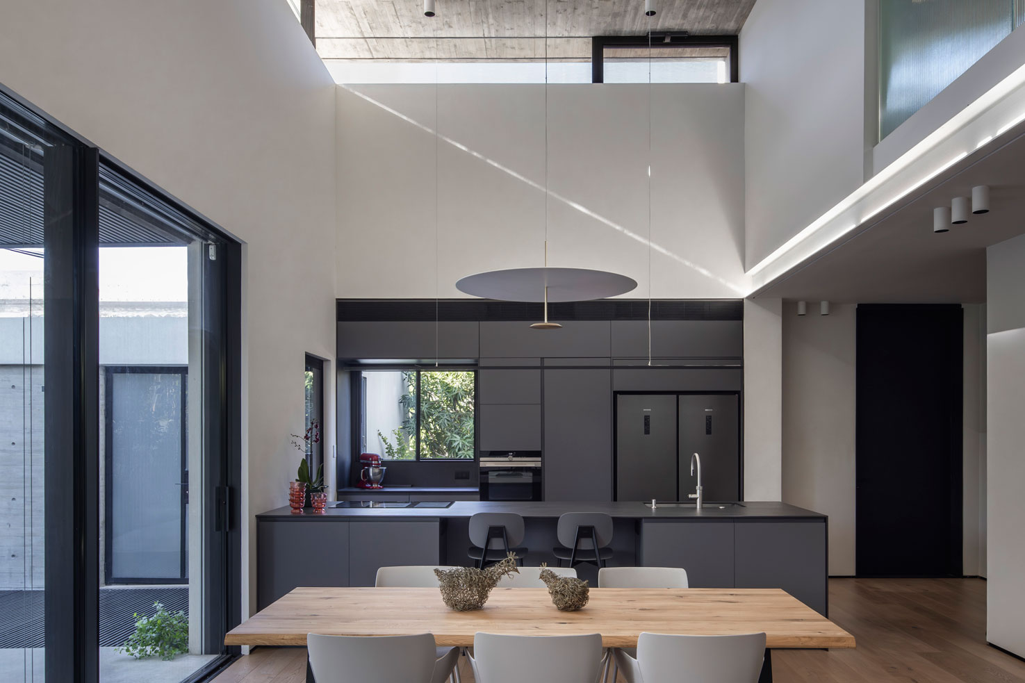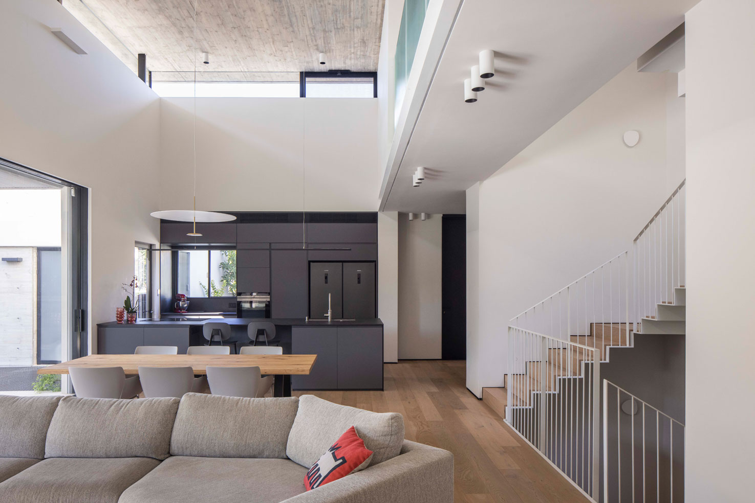 את הבית בתל-אביב תיכננו עבור זוג עם שני ילדים. מתוך המאסה הפנימית ״חצבנו״ חלל כפול בגובה שתי קומות, ומעליו מתחנו תקרת בטון דקיקה שמרחפת חצי מטר מעל הקירות ההיקפיים ומגדירה את האזור הציבורי. הפרדת הזכוכית בין התקרה לקירות מכניסה אור טבעי והחלונות העליונים מאפשרים לאוויר החם שעולה למעלה להשתחרר החוצה ולאוורר את החלל.