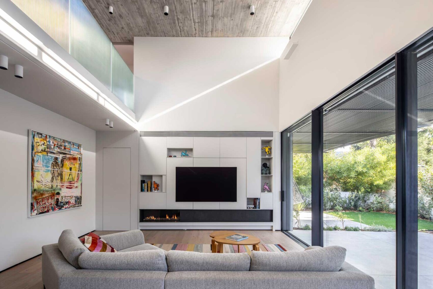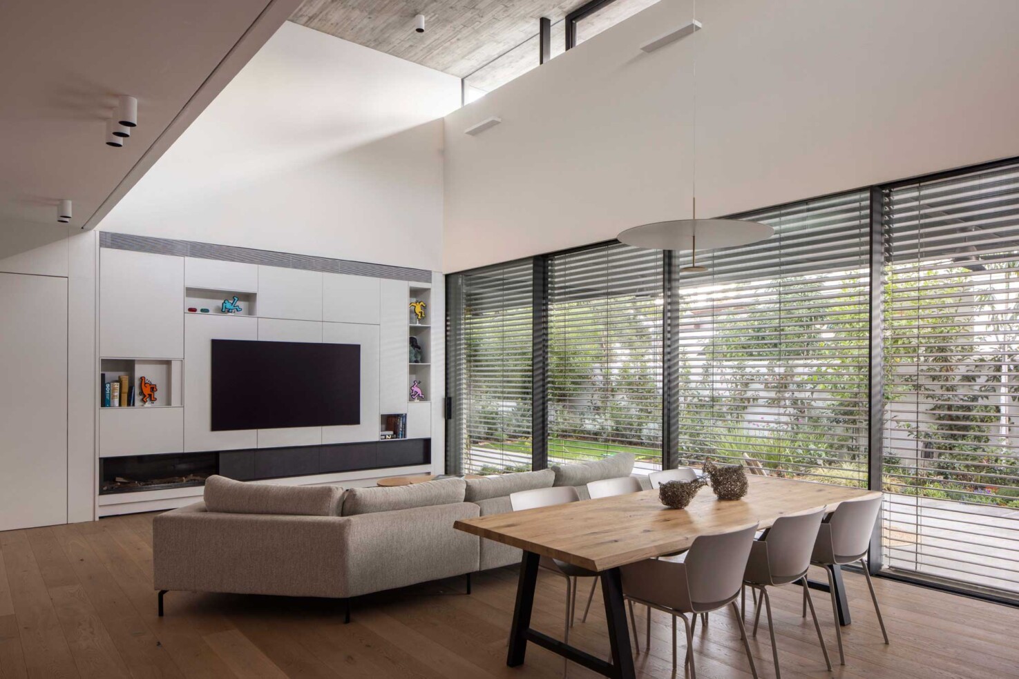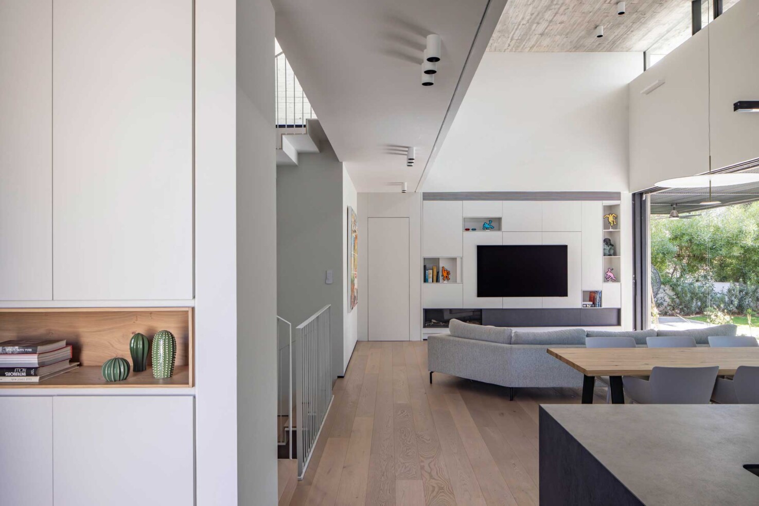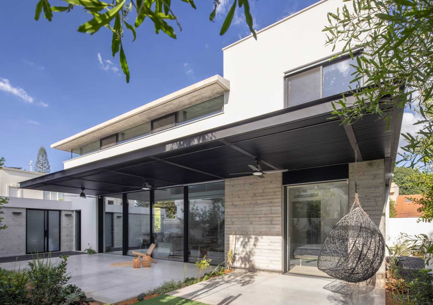 את הבית בתל-אביב תיכננו עבור זוג עם שני ילדים. מתוך המאסה הפנימית ״חצבנו״ חלל כפול בגובה שתי קומות, ומעליו מתחנו תקרת בטון דקיקה שמרחפת חצי מטר מעל הקירות ההיקפיים ומגדירה את האזור הציבורי. הפרדת הזכוכית בין התקרה לקירות מכניסה אור טבעי והחלונות העליונים מאפשרים לאוויר החם שעולה למעלה להשתחרר החוצה ולאוורר את החלל.